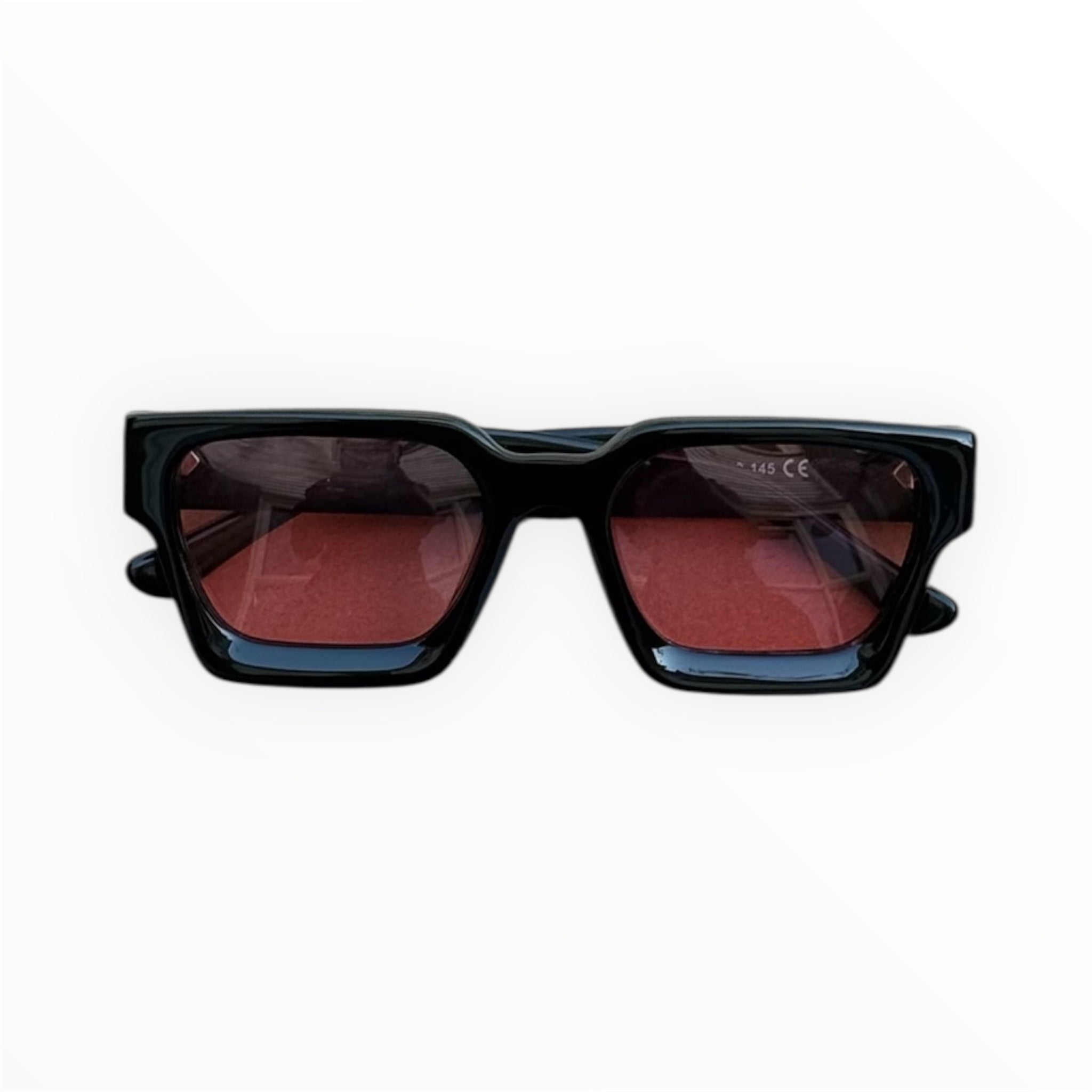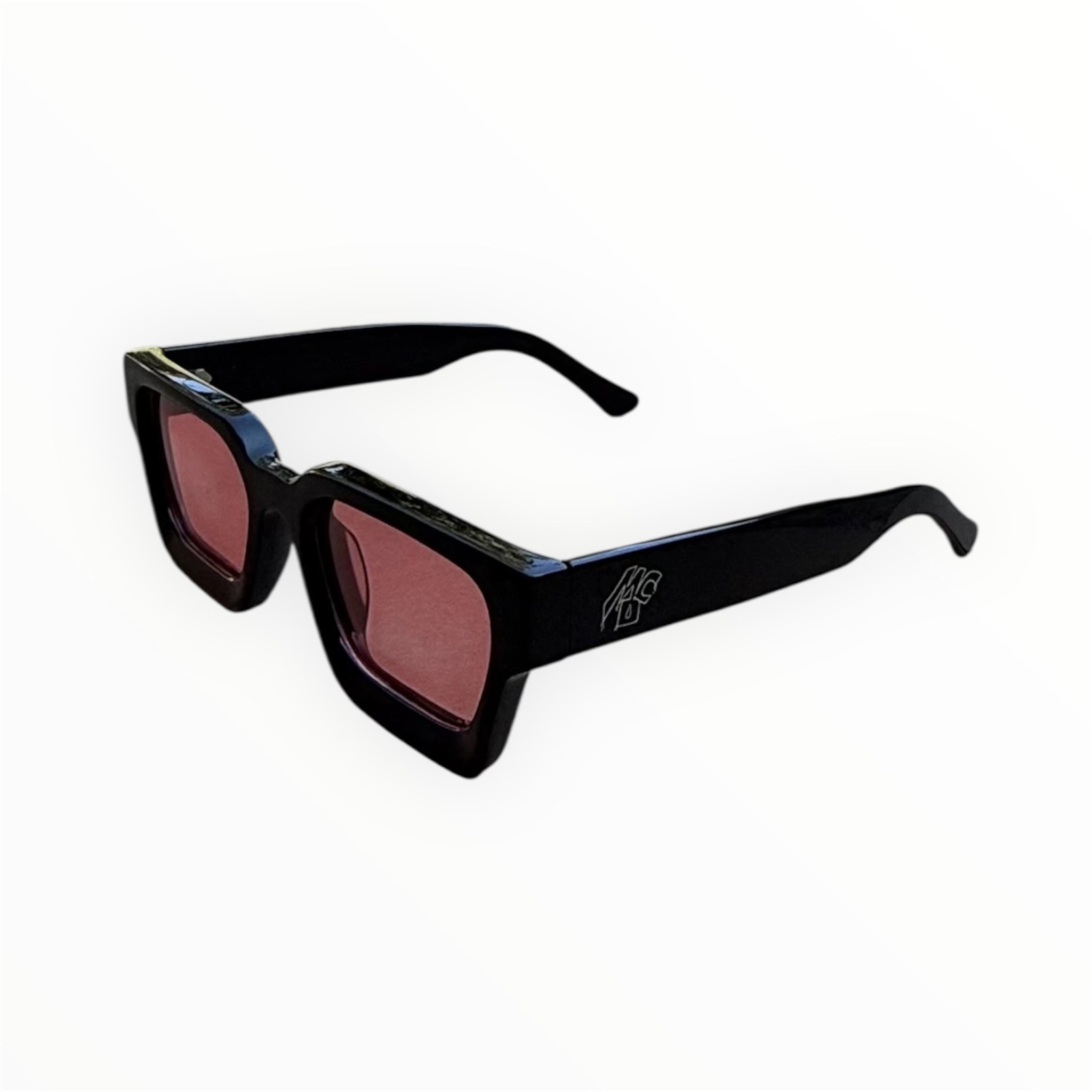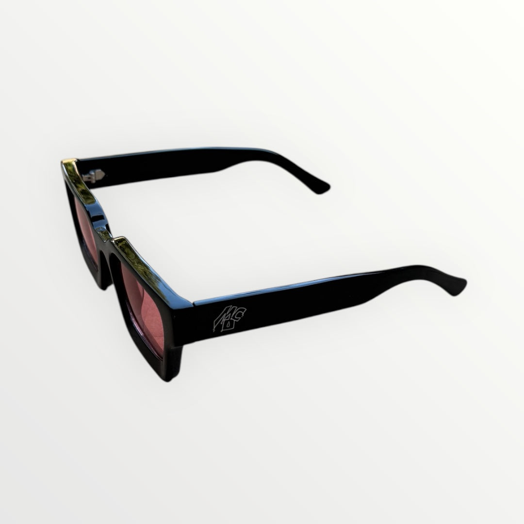 Black frame sunglasses with metal MCO logo on the side and bold red lenses.